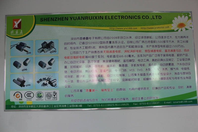深圳市圓睿鑫電子有限公司自2008年創(chuàng)立以來(lái),經(jīng)過(guò)誠(chéng)信耕耘,在為期兩年的時(shí)間內(nèi),已通過(guò)ISO9001:2000國(guó)際質(zhì)量體系認(rèn)證。公司廠房占地面積2000多平方米,員工100人,專業(yè)技術(shù)工程師6名,擁有國(guó)內(nèi)最先進(jìn)的生產(chǎn)和檢測(cè)設(shè)備,年產(chǎn)各類減速電機(jī)超過(guò)2~300萬(wàn)臺(tái)。因公司發(fā)展需要,于2020年底,將生產(chǎn)基地遷往擁有最美小鎮(zhèn)之稱的東莞市清溪鎮(zhèn),依山傍水,依托美麗的大自然環(huán)境和地方文化,全新的東莞市圓睿鑫電子有限公司將借助深圳母公司平臺(tái),一步步走上新的臺(tái)階。 東莞公司將繼續(xù)致力于生產(chǎn)銷售各類無(wú)刷減速電機(jī) 渦輪渦桿電機(jī),微型減速電機(jī),直流減速馬達(dá),交流手搖發(fā)電機(jī)、同步電機(jī)及空心杯電機(jī)等,電機(jī)直徑從6-60毫米為定位,系列產(chǎn)品廣泛用于智能家電、智能辦公自動(dòng)化設(shè)備、智能醫(yī)療、美容健身器材、遙控模型、電動(dòng)工具、高檔玩具以及其它工業(yè)驅(qū)動(dòng)裝置,如高檔玩具、游戲機(jī)、麻將機(jī)、飄香器、手機(jī)發(fā)電機(jī)、柔巾機(jī)、自動(dòng)噴霧器、汽車自動(dòng)設(shè)施、電動(dòng)牙刷、舞臺(tái)燈飾、圣誕產(chǎn)品、智能電子門鎖、VCD、DVD、水泵、氣泵、水表、煤氣閥、電磁閥、攪拌機(jī)、榨汁...